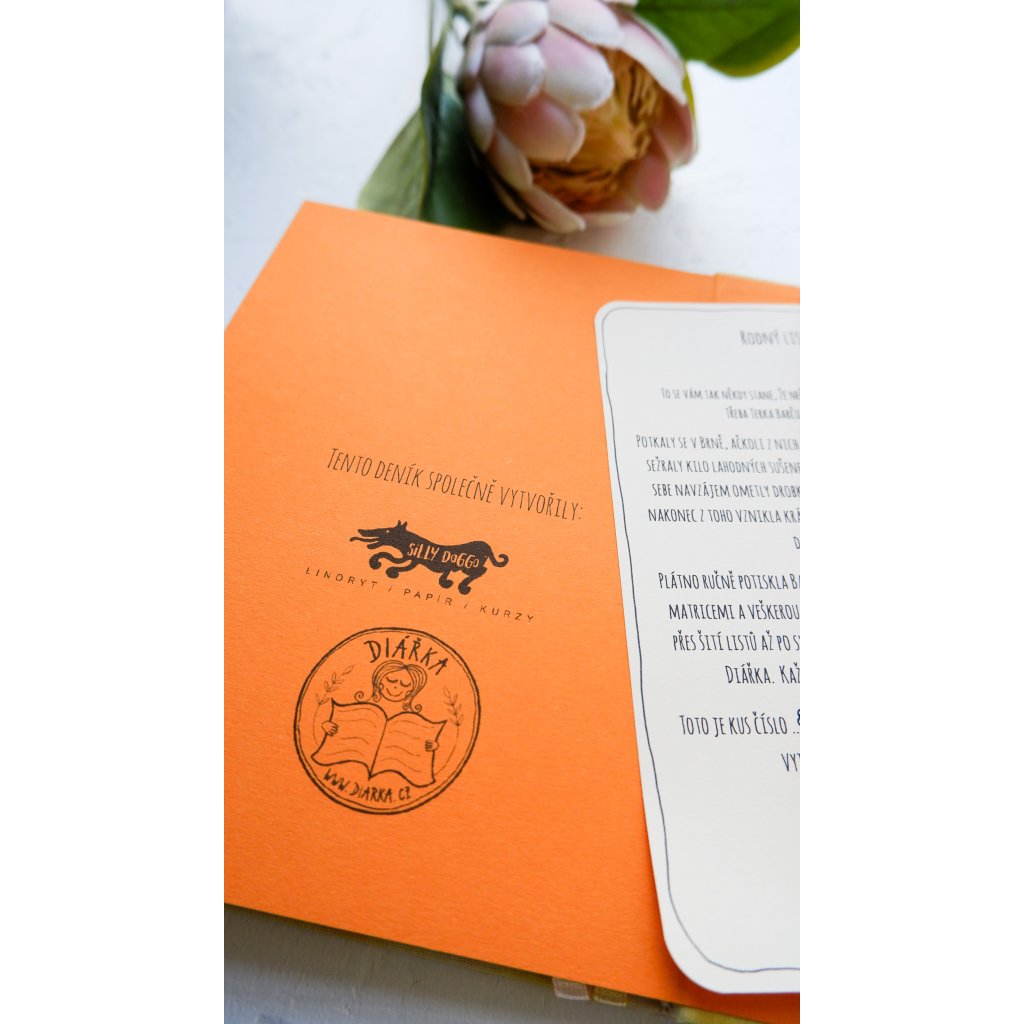Jedná se od potisku a barvení pláten, polepení desek, vlepení gumek, řezání papíru, skládání kapes, knižní vazby a další knihařské fajnšmekroviny o komplet ruční práci mojí a Terky Diářky. V kapse všech diářů najdete číslovaný rodný list a samolepky ode mne.