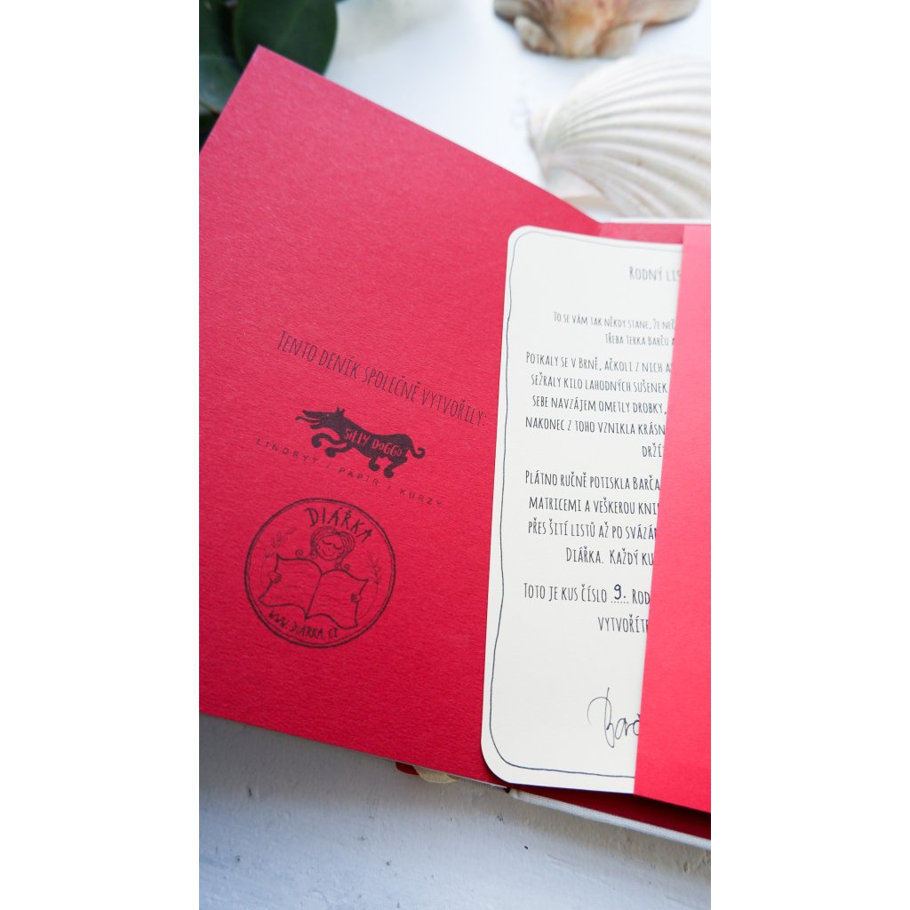 Jedná se od potisku a barvení pláten, polepení desek, vlepení gumek, řezání papíru, skládání kapes, knižní vazby a další knihařské fajnšmekroviny o komplet ruční práci mojí a Terky Diářky. V kapse všech diářů najdete číslovaný rodný list a samolepky ode mne.